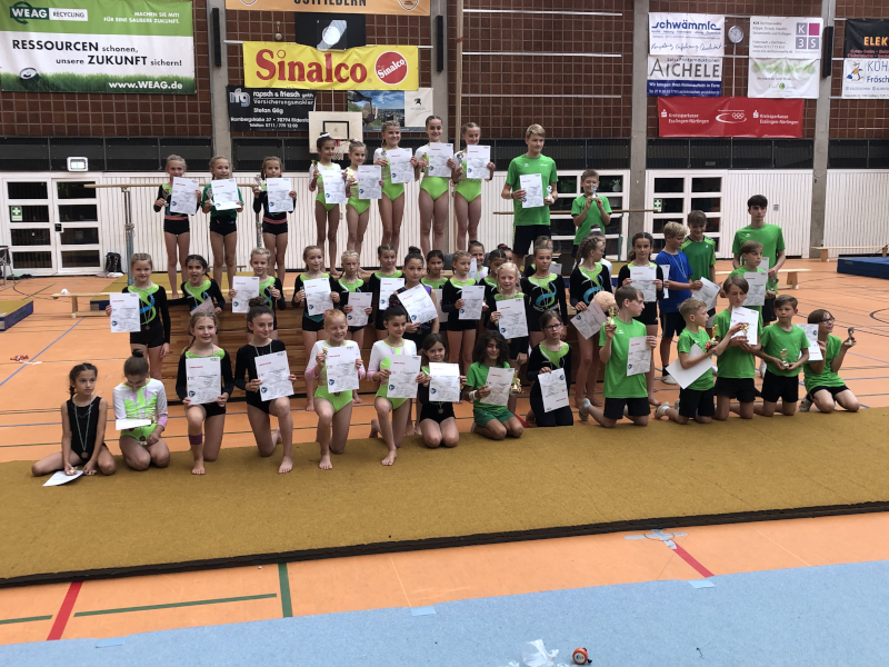 Es waren tolle Vereinsmeisterschaften im Turnen. Die verantwortlichen Organisatoren, Trainer und Betreuer um Martin Billerbeck, Marie Rödl, Nicolas Böder und Julia Pinzhoffer waren sehr zufrieden mit der Veranstaltung, die am vergangenen Wochenende vom 1. und 2. Juli stattfand. Alleine schon die Zahl der Anmeldungen waren ein Rekord, mit 82 Anmeldungen und dann 75 angetretenen Turner*innen hatten wir noch nie so ein großes Teilnehmerfeld, und übertrafen damit sogar die letztjährige Rekordmarke von 70 Teilnehmer*innen. Und auch die Zahl der helfenden Hände war überragend. Die Eltern unserer Turner*innen bzw. die Kuchen- und Salatspenden waren so zahlreich, dass wir erneut den Luxus hatten, auf ein paar Hände zu verzichten. Diejenigen, die spenden und helfen wollten, „durften“ eines „liegenlassen“…und am Ende waren es immer noch genügend Hände, dass jeder ohne großen Stress mitmachen konnte. Daher nochmals vielen Dank an alle Helfer und Spender. So verlief der Samstag prima. Bei vielen Händen war der Gerätetransport und Aufbau schnell erledigt und das freie Training konnte schon nach 1 1/2 Std. um 15:30 starten. Um 18:00 war Ende Training und die „Übernachter“ gingen zum Abendessen vor die Halle, wo Festwart Nico und Grillmeister Sandro bereits den Grill angeworfen hatten. Nach dem Essen tobten die Kids sich vollends aus, während wir Trainer es gemütlich auslaufen ließen und um 23:00 Uhr ging zum Schrecken der Kids plötzlich das Licht aus und mussten dann auch alle in den Schlafsack. Sonntags war dann um 8:00 Frühstück angesagt, denn um 9:00 kamen schon die ersten Helfer für den Wettkampf. Festwart Nicolas Böder weihte die Helfer schnell ein, so dass pünktlich zum Wettkampf der Kaffee und die Brötchen fertig waren. Währenddessen turnten sich die jüngeren Jungs und Mädchen schon Mal an den Geräten ein, und um 10:00 startete dann pünktlich der Wettkampf. Der Wettkampf lief super durch, dank der disziplinierten Turner*innen und unseren schnellen Kampfrichtern. Und so konnte pünktlich um 12:15 Uhr die Siegerehrung stattfinden, aber vorher zeigten die Nellinger Jazztänzerinnen um Lisa und Lena Barthelmie einen Auszug aus dem Repertoire ihrer Tanzgruppen: Mit 3 tollen Tänzen überbrückten sie die Zeit, bis die Urkunden gedruckt waren, und begeisterten damit die zahlreichen Zuschauer. Vor der Siegerehrung dankte Abteilungsleiter Raphael Hekler noch dem ganzen Trainerteam und überreichte diesen sowie den beteiligten Kampfrichtern ein kleines Präsent als Dank für die viele Arbeit während des ganzen Jahres. Der zweite Durchgang mit den älteren Jungs und jungen Damen konnte dann um 12:45 mit dem Einturnen starten, und um 13:30 war dann deren Wettkampfbeginn. Auch dieser Durchgang lief optimal und in nur 2 Std. war der Wettkampf schon vorbei und die Siegerehrung konnte direkt stattfinden. Nach dem Wettkampf musste dann leider noch alles wieder abgebaut und zurück in die Riegelhofhalle transportiert werden. Dank vieler Helfer aus Turner*innen und Eltern war aber auch das relativ schnell erledigt, um 17:00 Uhr war fast alles verstaut. Erneut konnten wir trotz der vielen Arbeit ein mehr als positives Feedback ziehen. Es ist viel Arbeit, die sich zum Glück auf mehrere Schultern verteilt. Aber dank der vielen Helfer lässt sich solch eine große Veranstaltung dann doch stemmen, wir können auf unsere Turnabteilung in der Hinsicht jedenfalls sehr, sehr stolz sein. Wir freuen uns jedenfalls schon jetzt wieder auf 2024.